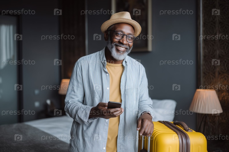 Портрет чернокожего мужчины среднего возраста, улыбающегося и держащего смартфон в гостиничном номере