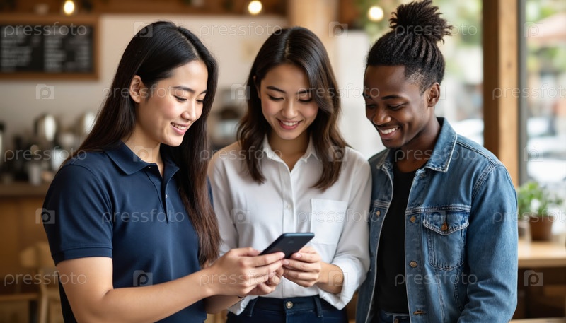 Мультиэтнические друзья улыбаются, глядя на смартфон в помещении