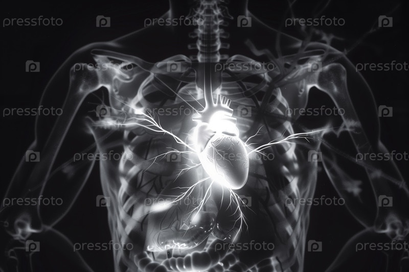 Рентген грудной клетки человека, показывающий сердце и кровеносную систему в медицинской визуализации