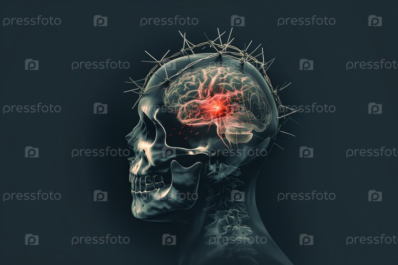 Череп с мозгом, испытывающим человеческую боль Подчеркивается красной светящейся областью