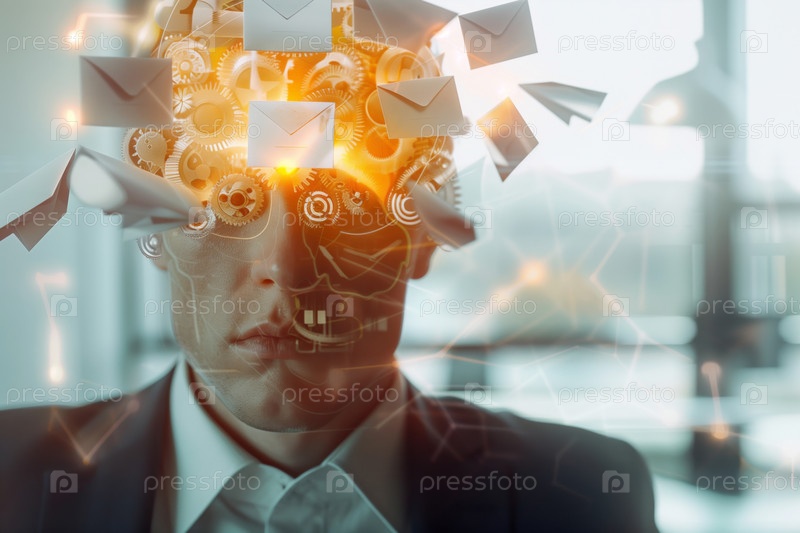 Молодой человек визуализирует цифровую коммуникацию и искусственный интеллект