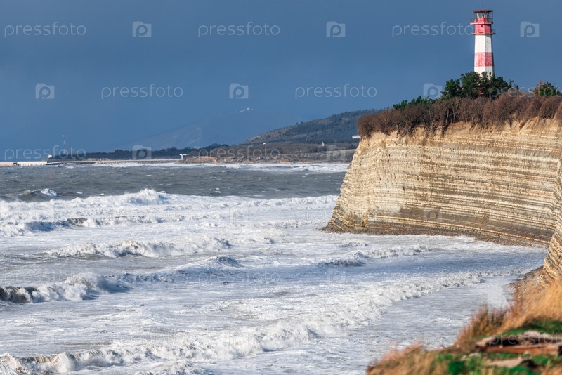 Геленджикский маяк стоит на высоком скалистом берегу. Сильный шторм в Черном море. Большие волны качаются по высокому берегу. Солнце светит сквозь облака