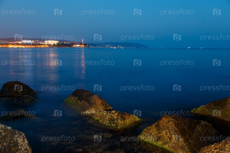 Геленджикский маяк в вечернее сумерки.Светы маяка отражаются в воде.Маяк стоит на высокой скале.На переднем плане есть камни в воде, покрытые водорослями