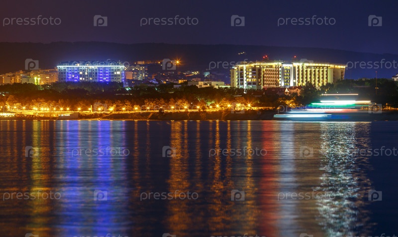 Геленджикский курорт ночью под лунным светом. Светильники отражаются в геленджикском заливе. На заднем плане Кавказские горы. Корабль плавает на воде