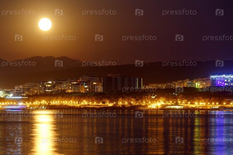 Геленджикский курорт ночью под лунным светом.Огни, отражающиеся в геленджикском заливе.Кавказские горы на заднем плане