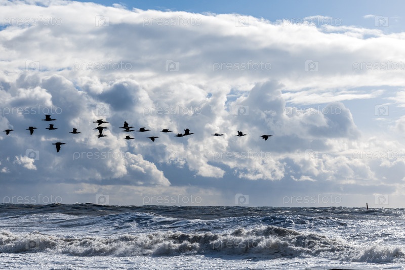 Мигрирующие птицы летают низко над большими штормовыми волнами. Ураган в Черном море. Геленджик. Солнце, пена, брызги
