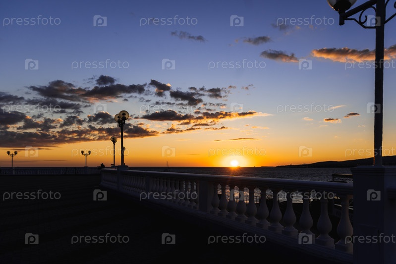 Набережная курорта Геленджик на закате солнца.Балюстрада и огни