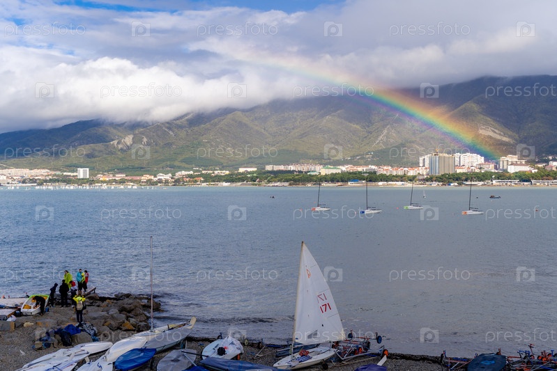 Радуга над заливом, где припаркованы яхты. На переднем плане яхта на пляже. В фоне - горы. Штормовые облака, закат солнца. Геленджик, Черное море
