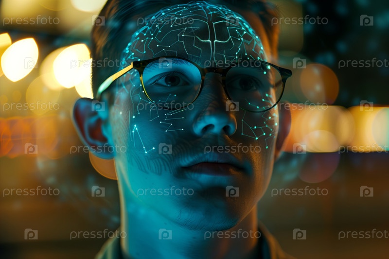 Портрет молодого человека с очками, анализирующего цифровой интерфейс мозга