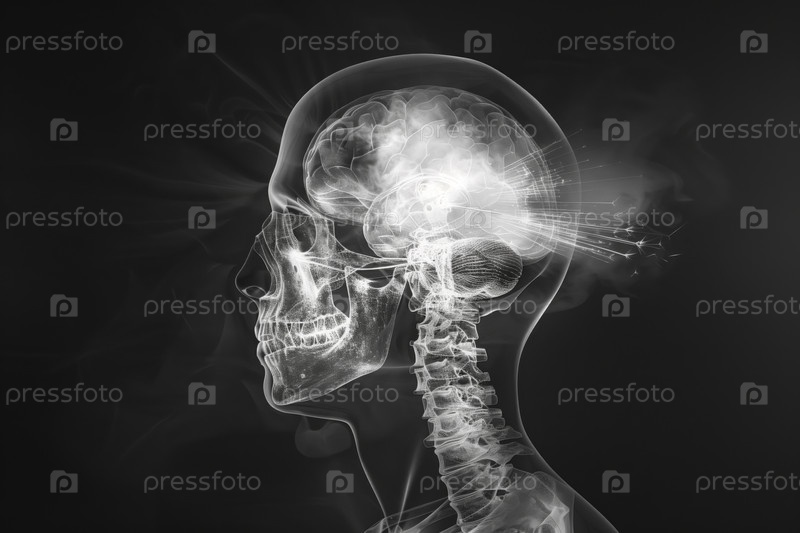 Боковой вид человеческого черепа и мозга, проходящего медицинское визуализационное сканирование