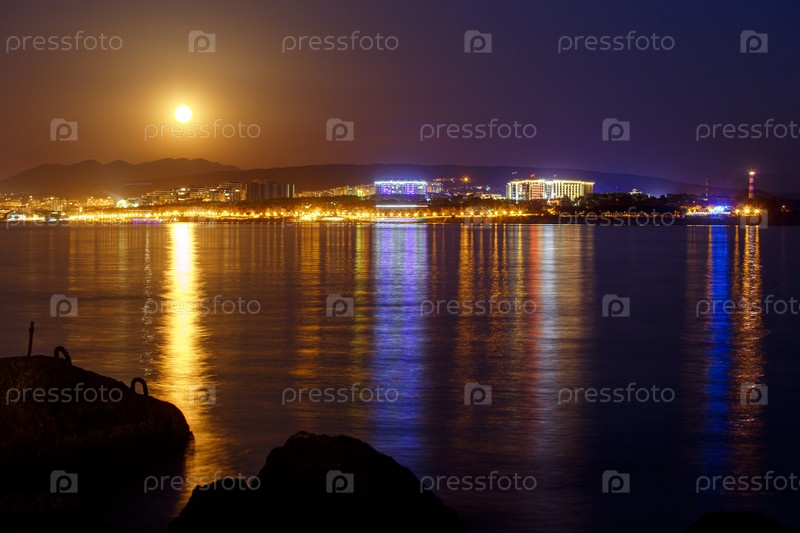 Геленджикский курорт ночью под лунным светом. Светильники, отражающиеся в геленджикском заливе. Кавказские горы на фоне. Камни на переднем плане