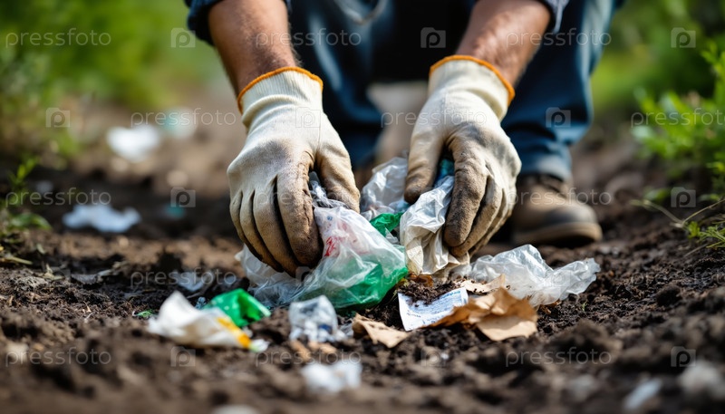 Молодой взрослый человек собирает пластиковые отходы на открытом воздухе с перчатками