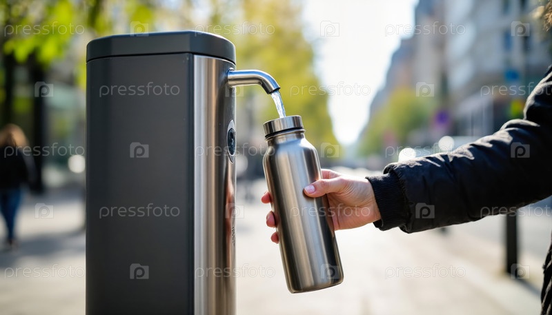 Молодой взрослый мужчина заправляет бутылку из нержавеющей стали в общественном фонтане