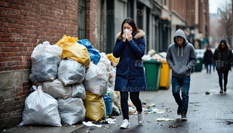 Молодая женщина закрывает нос, проходя мимо мусорных мешков на городской улице
