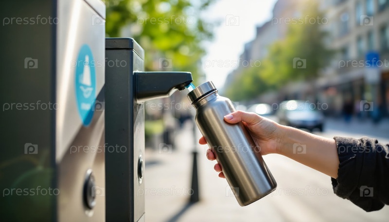 Молодая взрослая женщина заправляет многоразовую бутылку с водой в общественном фонтане