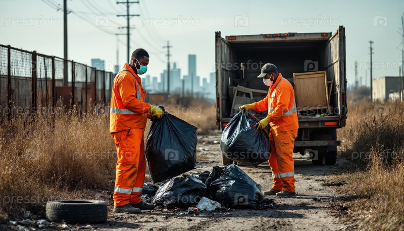 Два мужчины среднего возраста собирают мешки с мусором возле грузовика в городской окраине