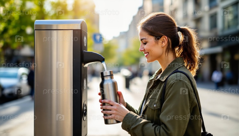 Молодая взрослая женщина пополняет бутылку с водой в городском общественном фонтане