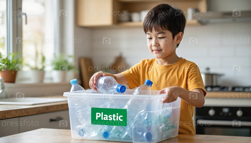 Мальчик сортирует пластиковые бутылки для переработки в современной азиатской кухне