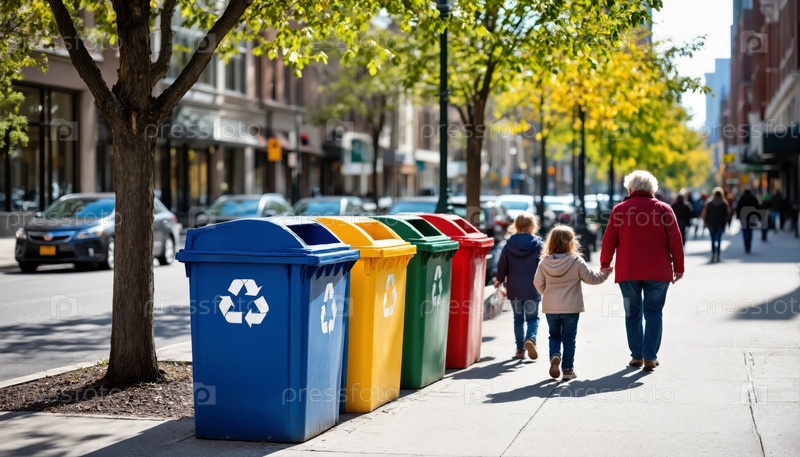 Пожилая женщина ходит с двумя детьми мимо мусорных баков в центре города