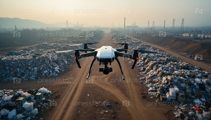 Дрон летает над свалкой, захватывая загрязнение окружающей среды на восходе солнца