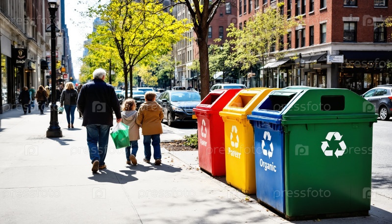 Старший мужчина ходит с двумя детьми мимо красочных мусорных баков