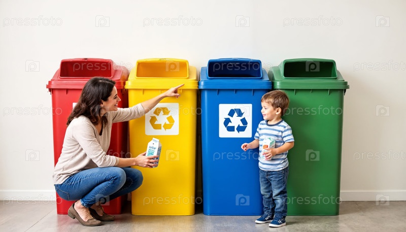 Женщина учит молодого мальчика переработке напротив красочных мусорных баков