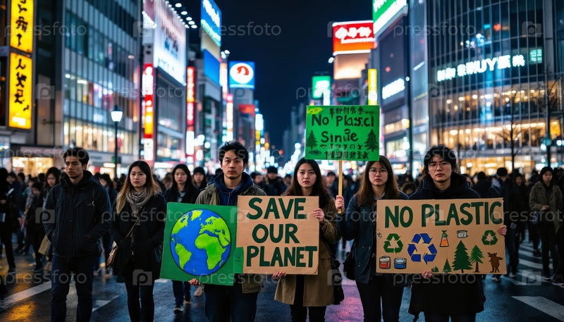 Группа молодых азиатских взрослых маршируют с экологическими знаками протеста ночью