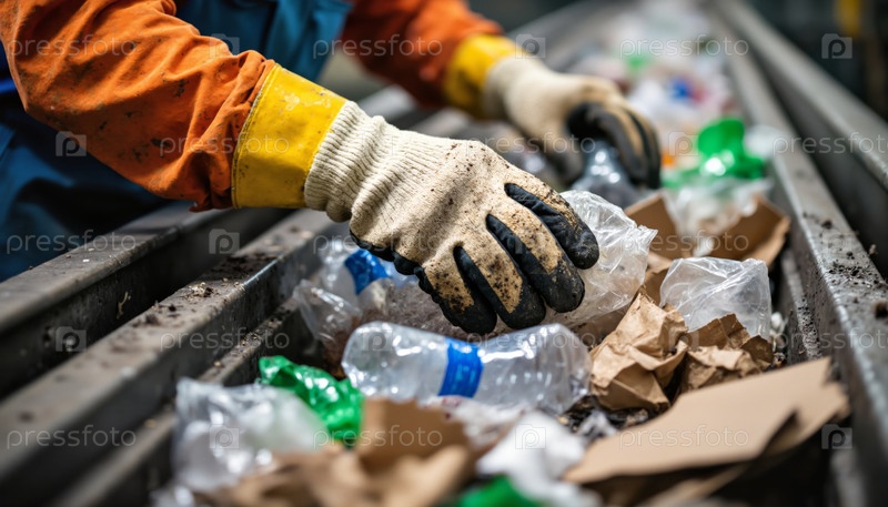 Мужчина среднего возраста сортирует пластиковые бутылки на перерабатывающем конвейерном поясе