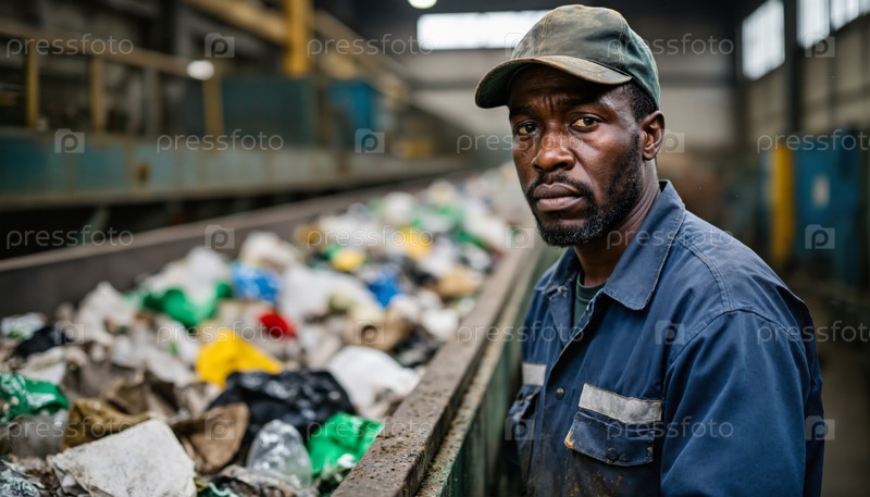 Портрет чернокожего человека среднего возраста, работающего на заводе по сортировке отходов
