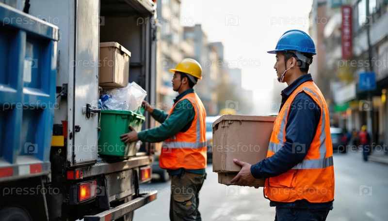 Азиатские мужчины среднего возраста собирают мусор на городской улице во время рабочего дня