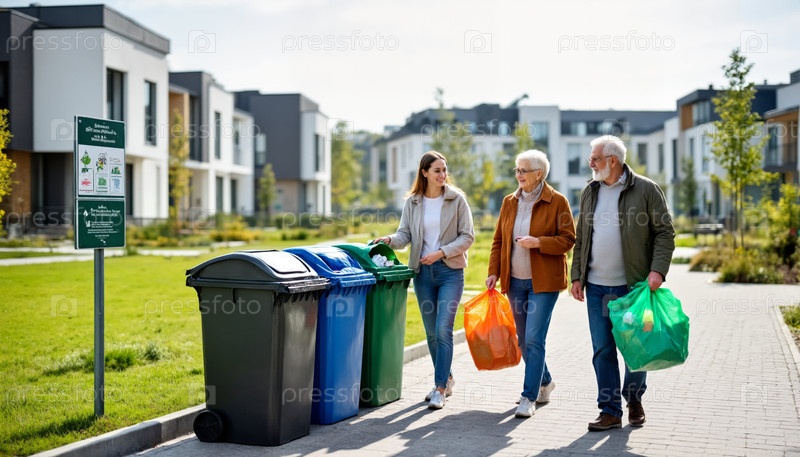Молодая женщина и старшая пара сортируют отходы на открытом воздухе