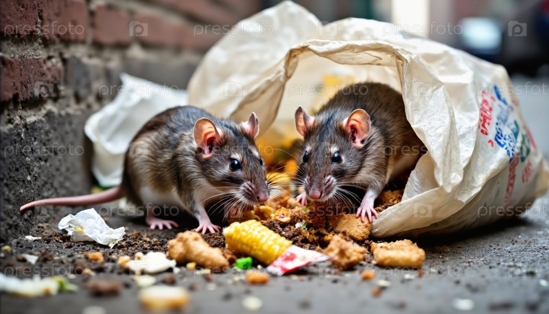 Две крысы, съедающие остатки пищи, разливаются из пластикового мешка на городской тротуаре