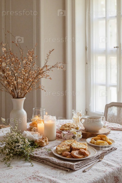 Рустический набор столов для завтрака с блинами и свежими цветами у окна