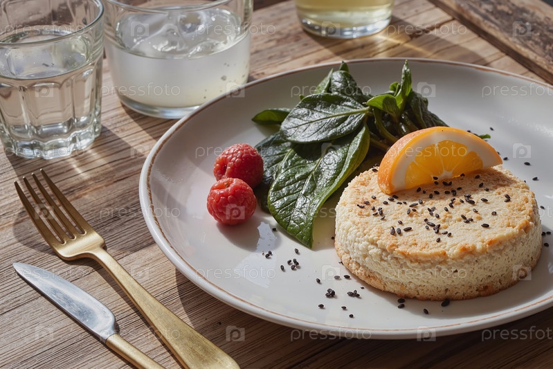 Здоровое гурманское блюдо с выпечённым сыром, украшенным лимоном и зеленью