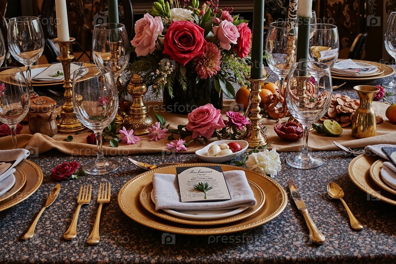 Элегантное столовое убранство с цветочным центром и золотыми акцентами для мероприятия