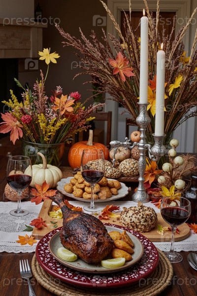 Осеннее столовое убранство с жареным мясом и декорациями сезонного урожая