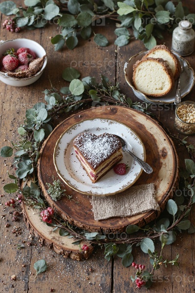 Слиток торта в форме сердца с ягодами и сахаром в порошке на деревенском столе