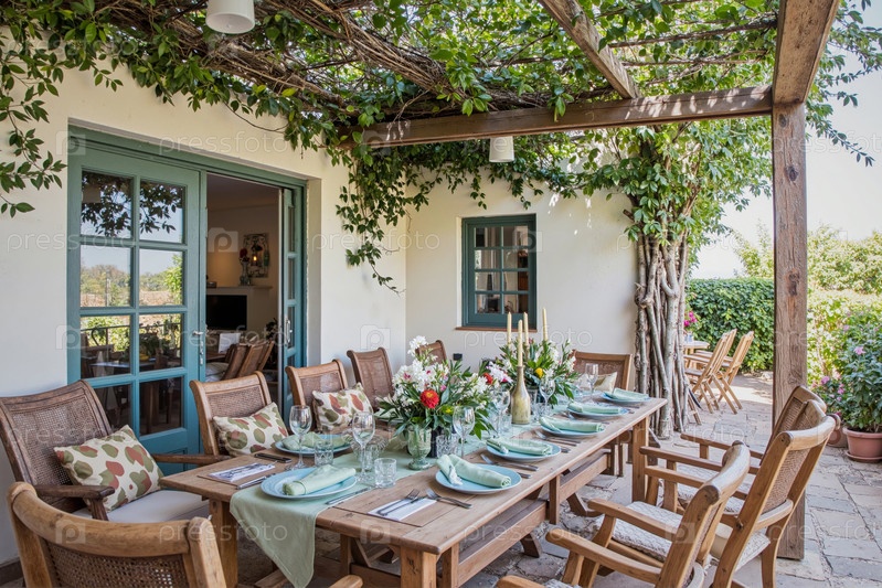 Набор столового стола на открытом воздухе для собрания под перголой с зеленью