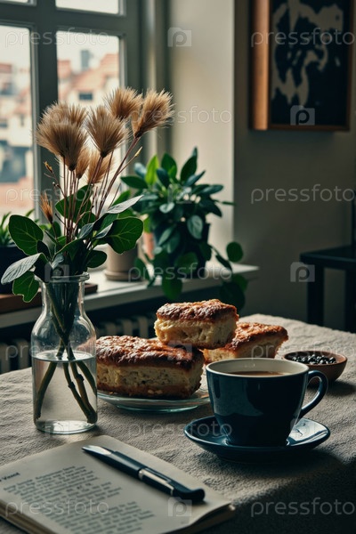 Свежие кондитерские изделия и кофе на столе возле окна в уютной домашней обстановке