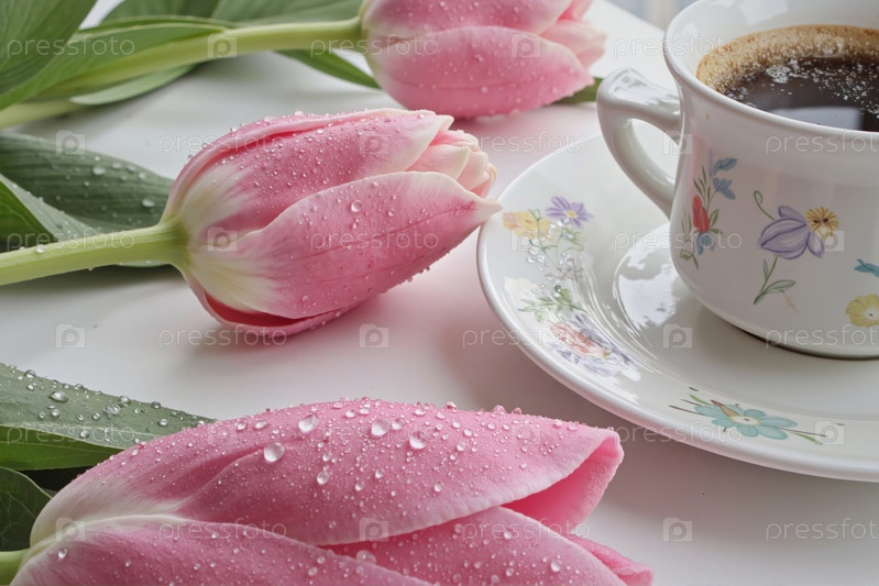 Свежие розовые тюльпаны с каплями воды, лежащими рядом со стаканом черного кофе