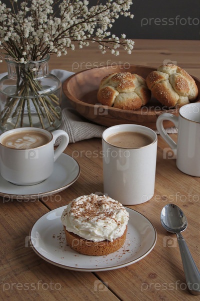 Свежие кондитерские изделия и кофе подаются на деревянном столе в уютной внутренней обстановке
