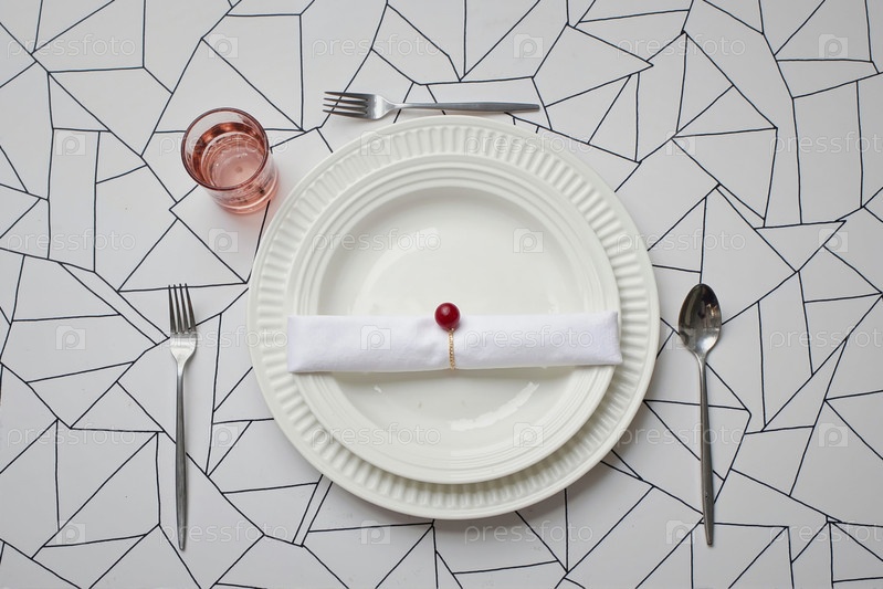 Пустая тарелка с салфеткой и вишней, расположенной на геометрической таблице