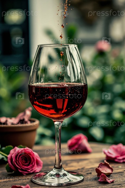 Стакан красного вина, брызгающего в окружении розовых роз на деревянном столе