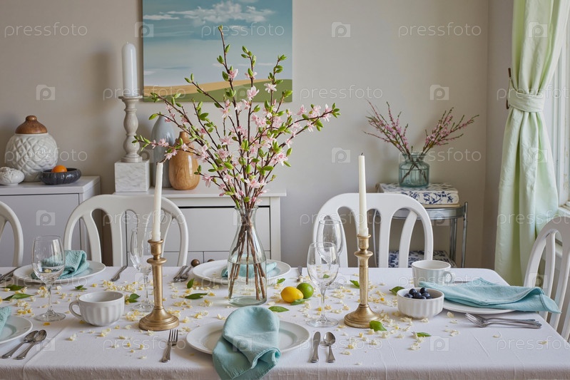 Элегантный столовой стол с цветущими ветками и свежими фруктами