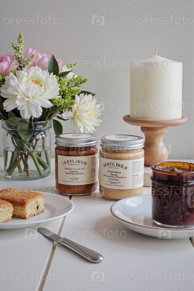 Домашние варенья и печенье расположены на столе с цветами и свечами
