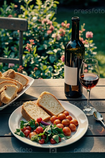 Свежий хлеб и помидоры с красным вином на открытом столе в солнечный день