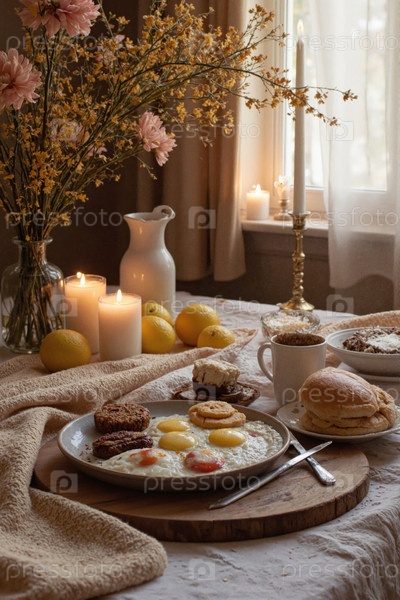 Рустический стол для завтрака с яйцами и выпечкой в уютной утренней обстановке