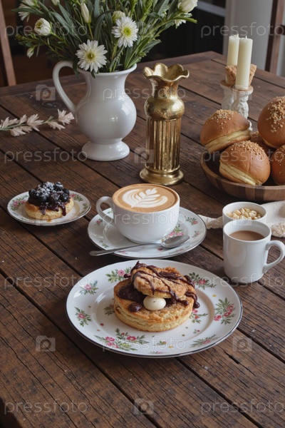 Разнообразные выпечки и кофе расположены на деревянном столе во время завтрака