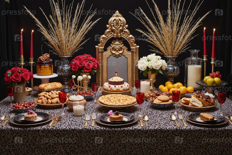 Роскошный праздничный банкетный стол с разнообразными десертами и выпечкой