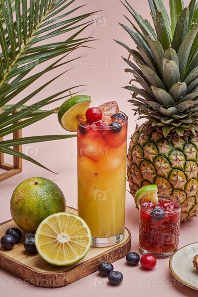 Освежающий тропический фруктовый сок и коктейль, украшенный ягодами и цитрусовыми